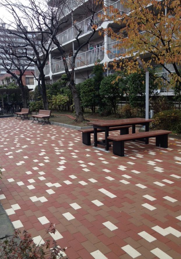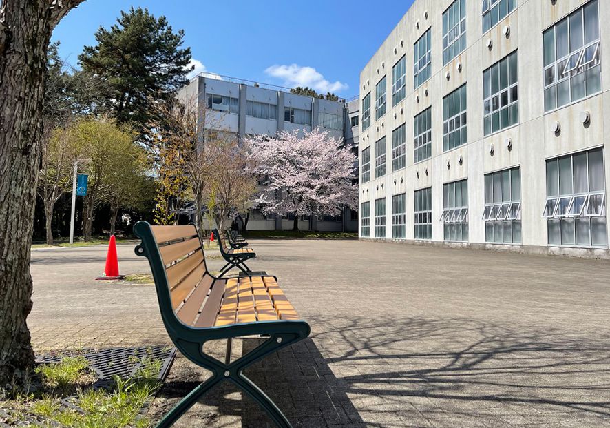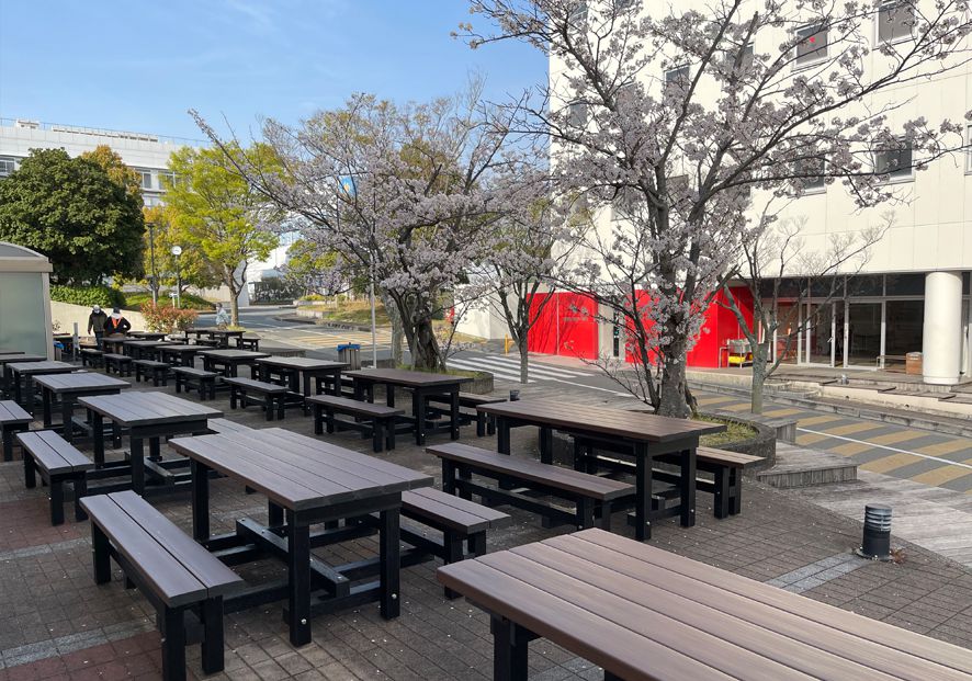 桜並木と鮮やかな木調の再生樹脂が織りなす調和