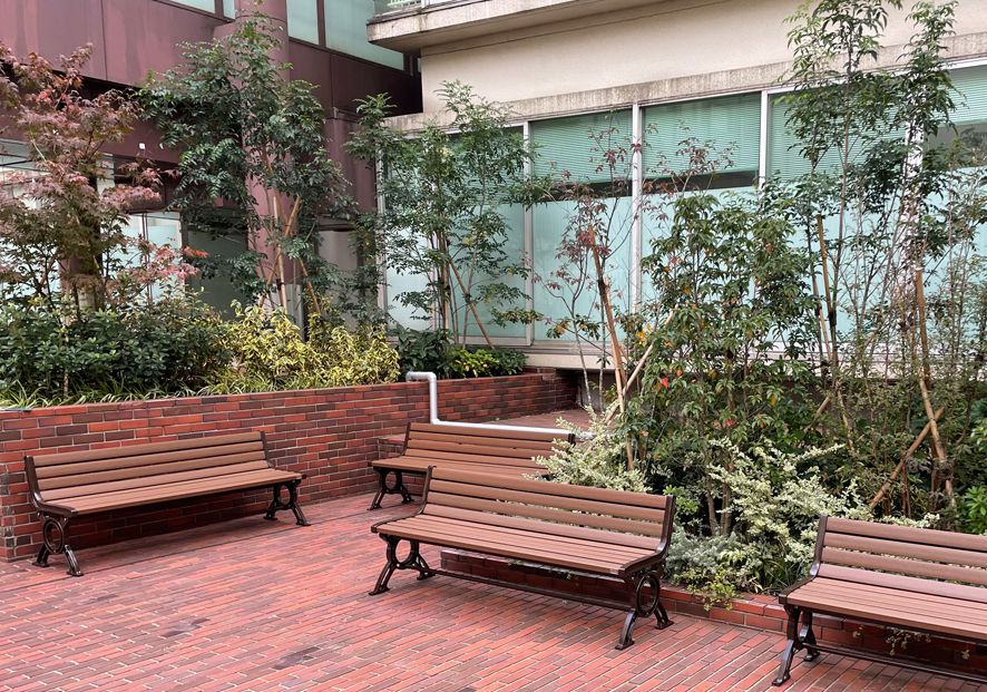 木陰に設置されたベンチは、炎天下から人々を涼ませ木漏れ日を通して木々の葉が揺れる音は、心地よい安らぎを与えてくれます。